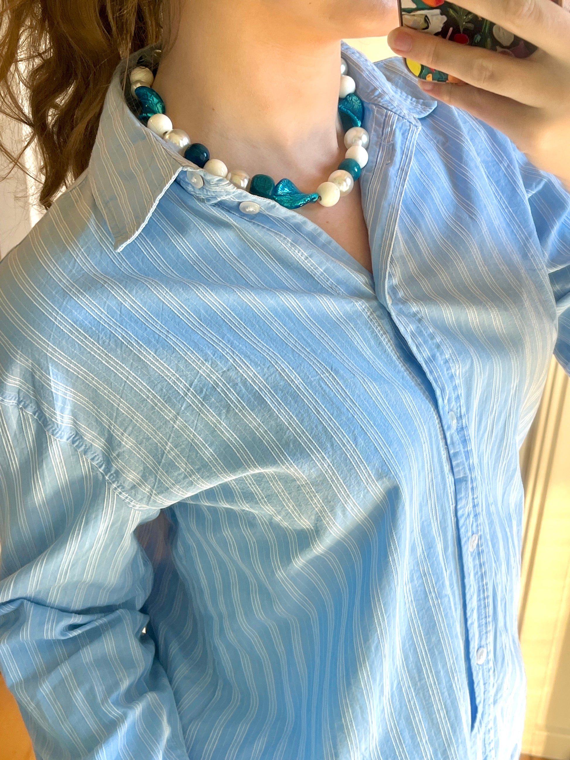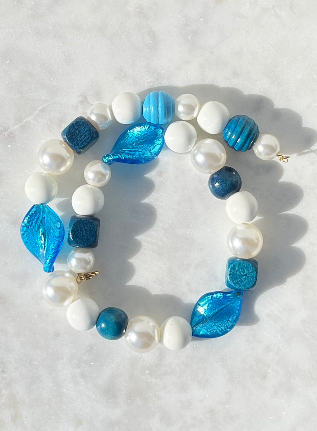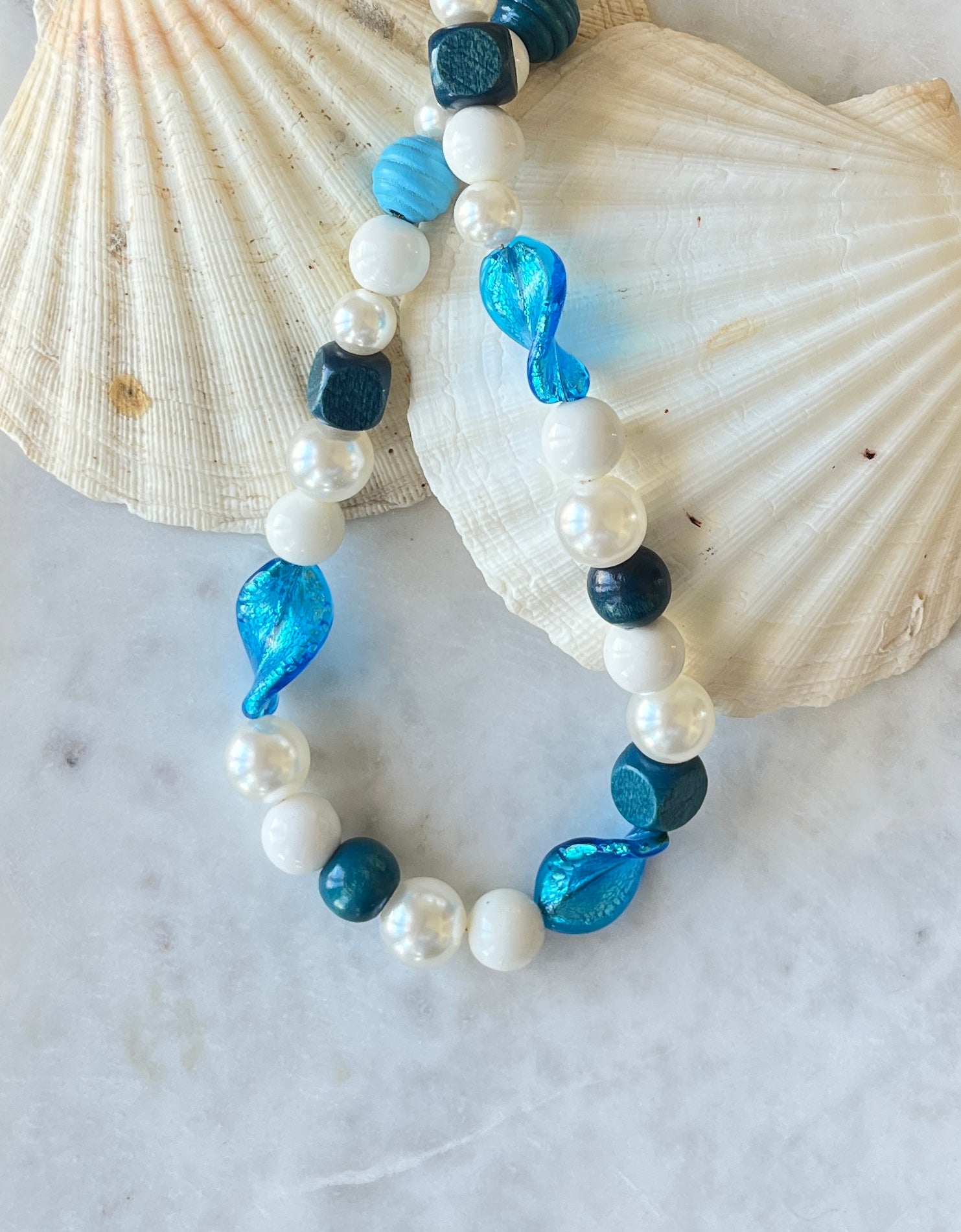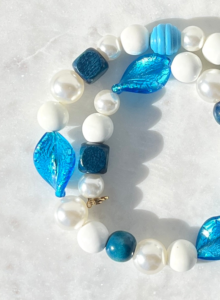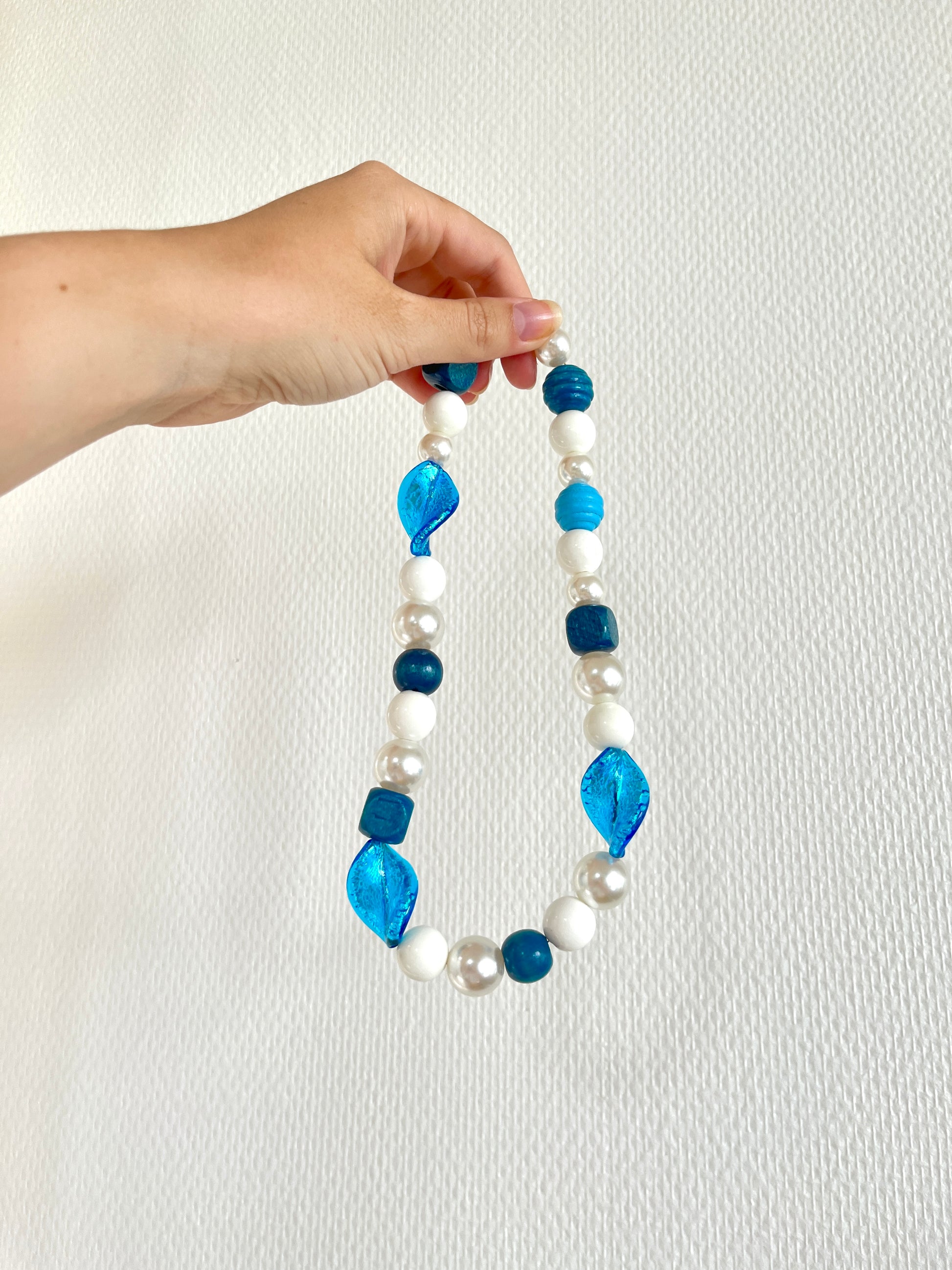 Denne unikke halskæde prydes af store, chunky perler lavet af akryl, træ og glas i smukke nuancer af hvid og blå 🌟