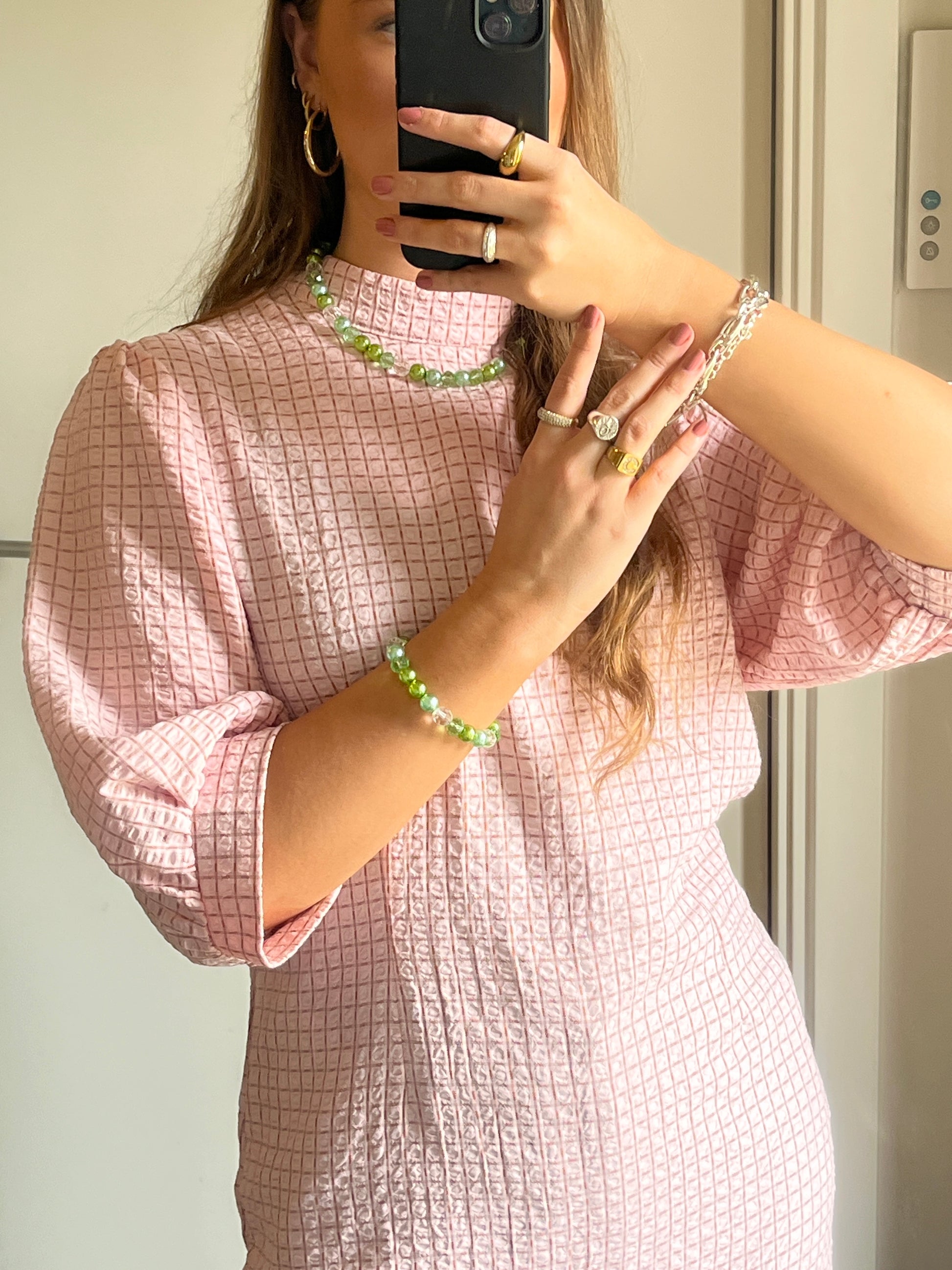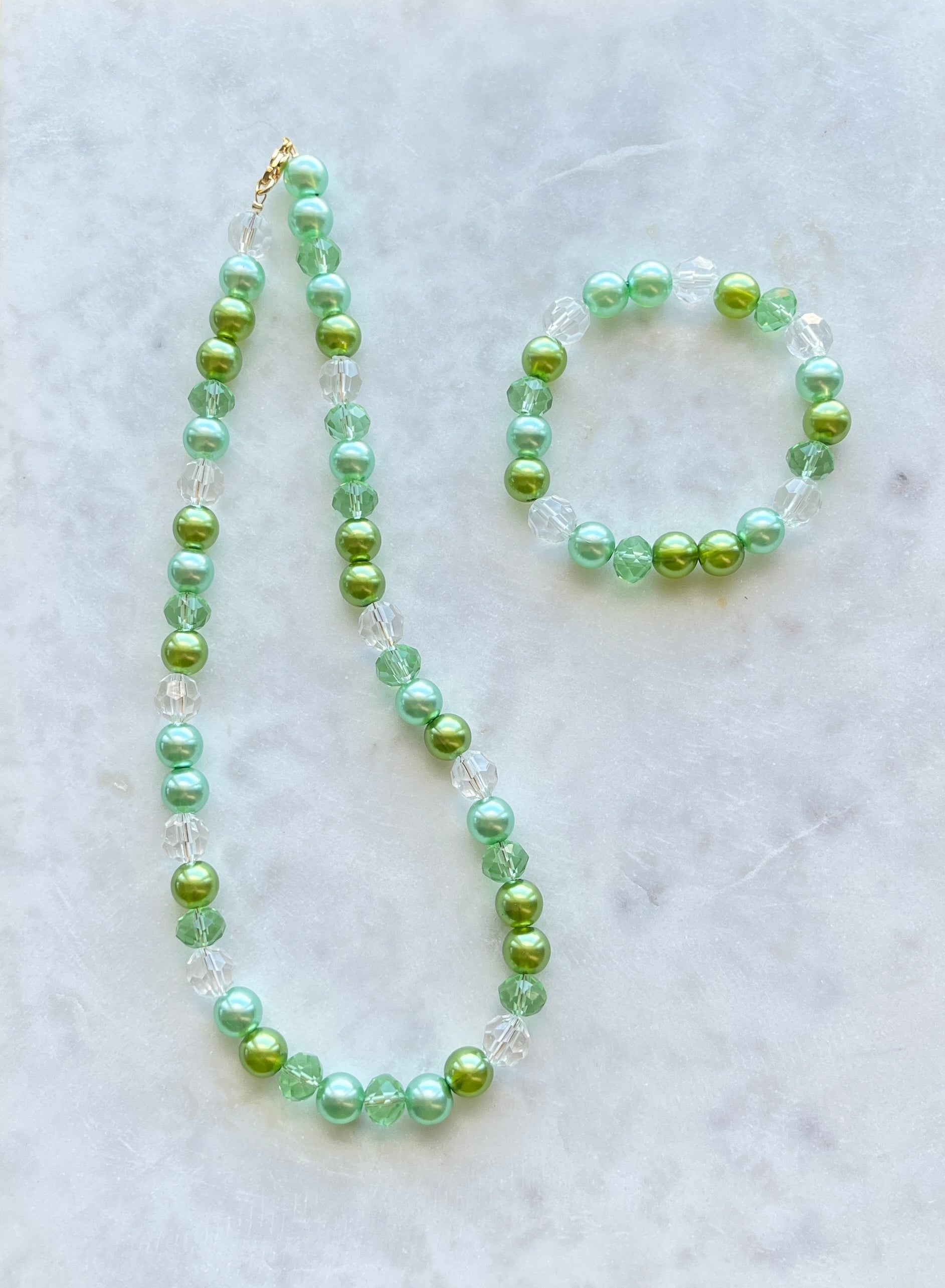 Et frisk og livligt smykkesæt i grønne og klare perler, der leder tankerne hen på spirende blade og solrige forårsdage 🌸💚🌸💚 Perler af glas og akryl.