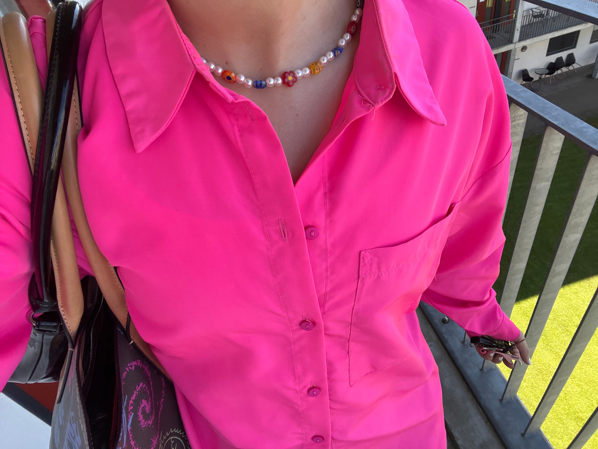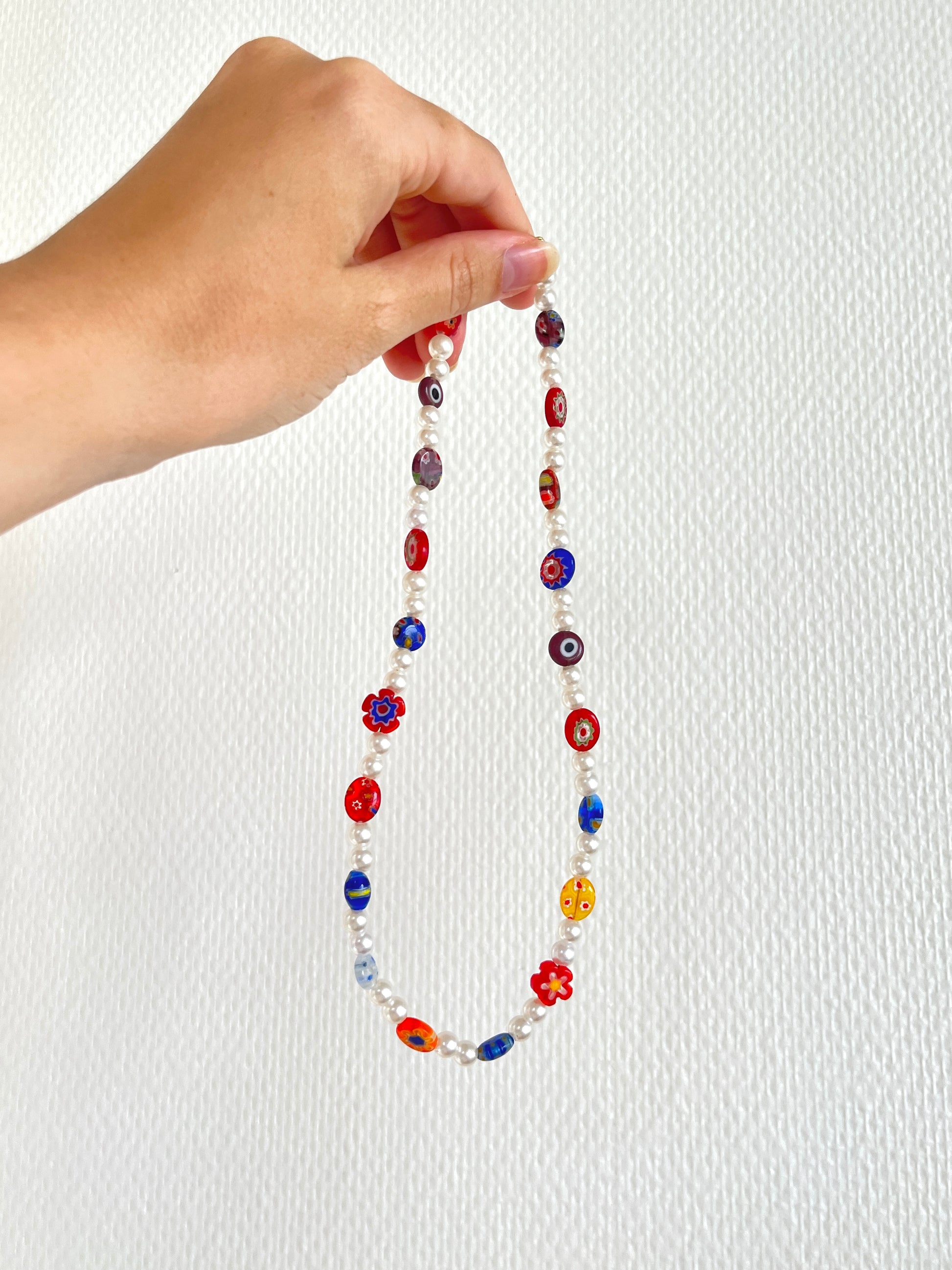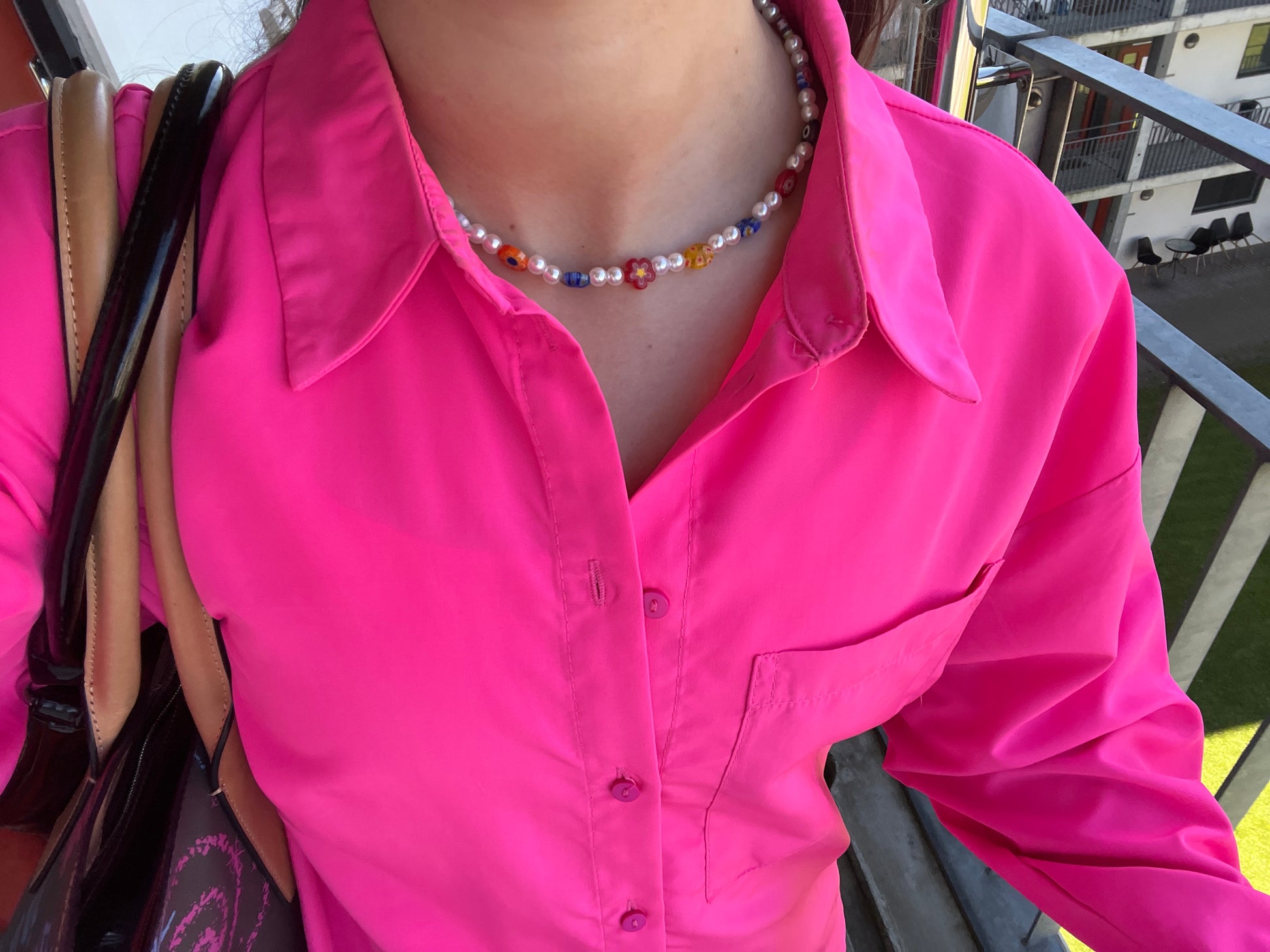 Karneval halskæden er en fin og farverig halskæde. De små glasperler med blomster- og mønsterdetaljer tilfører personlighed og varme, mens de hvide perler skaber ro og harmoni i udtrykket 🌸✨ Et smykke til dig, der elsker farver - men stadig holder det enkelt.