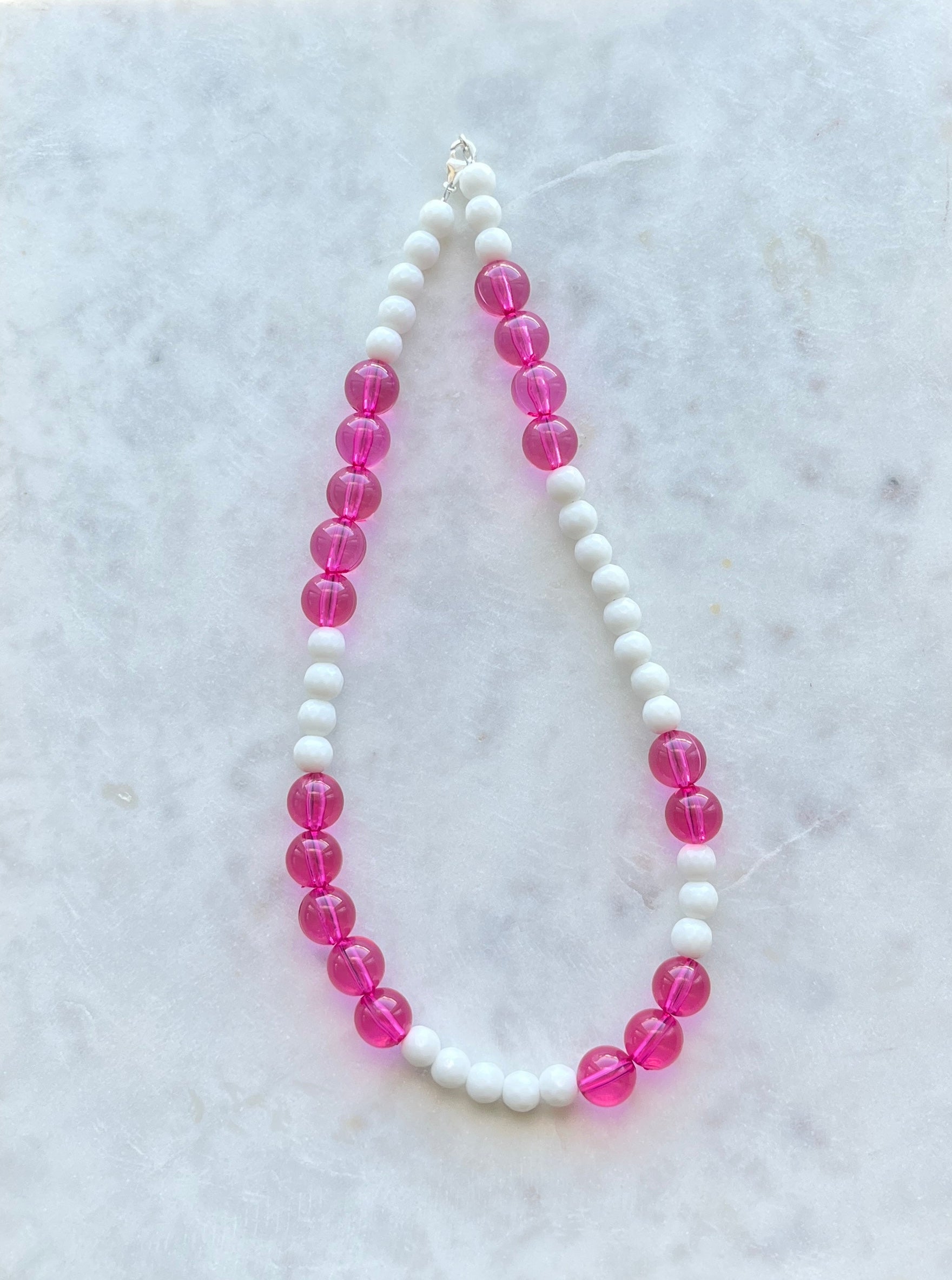 En flot halskæde med skiftevis hvide glasperler og klare skinnende pinke akrylperler 💞💞💞💞