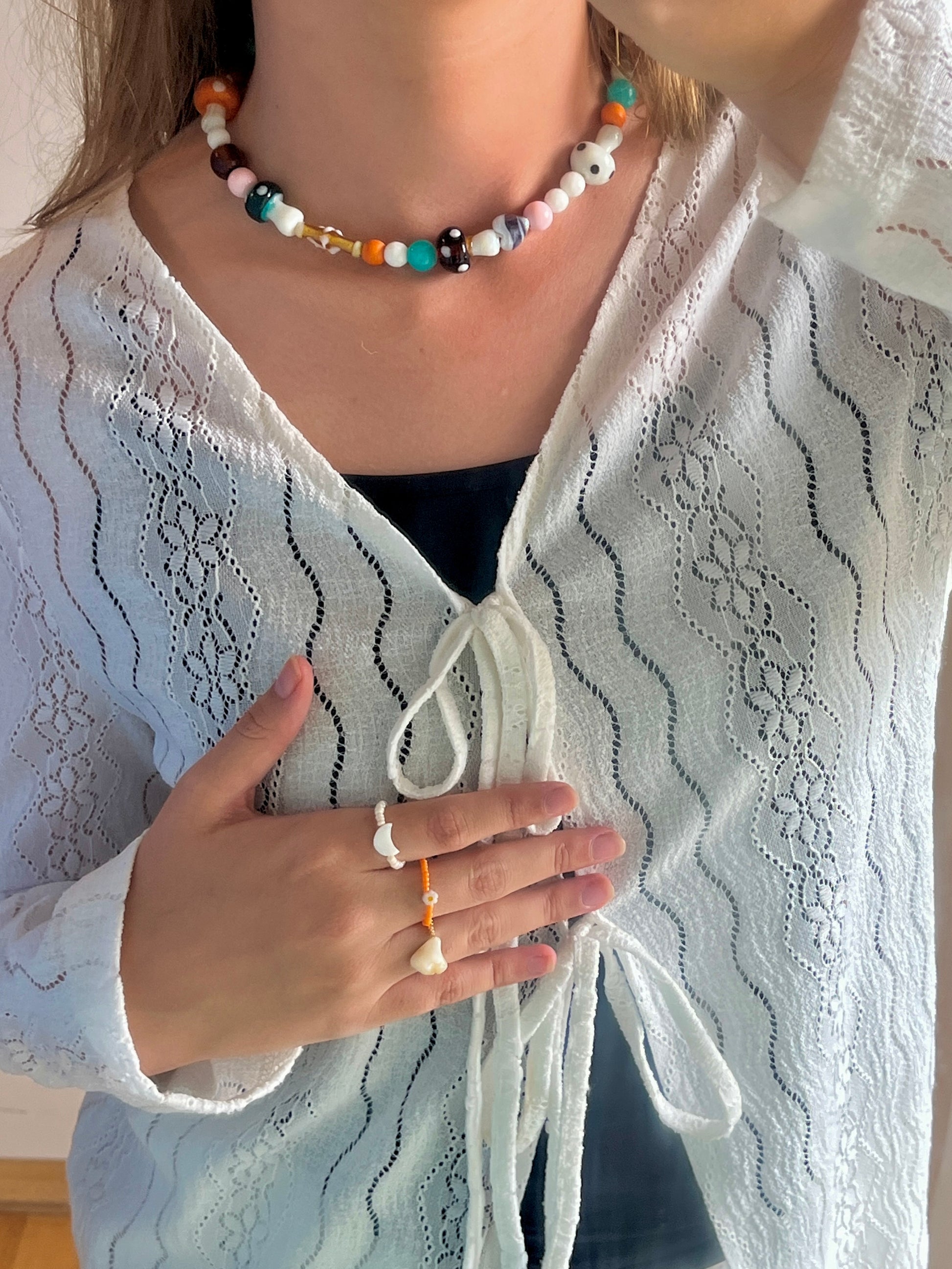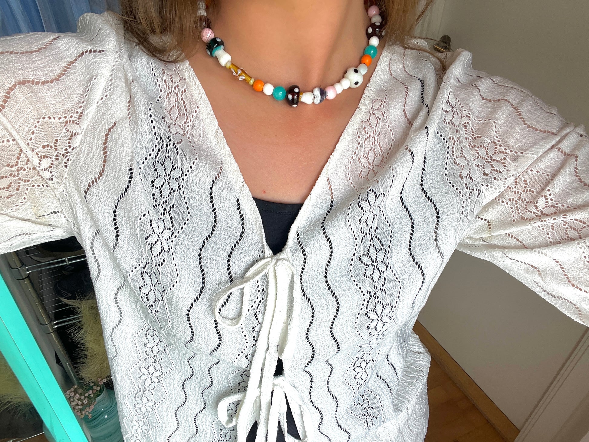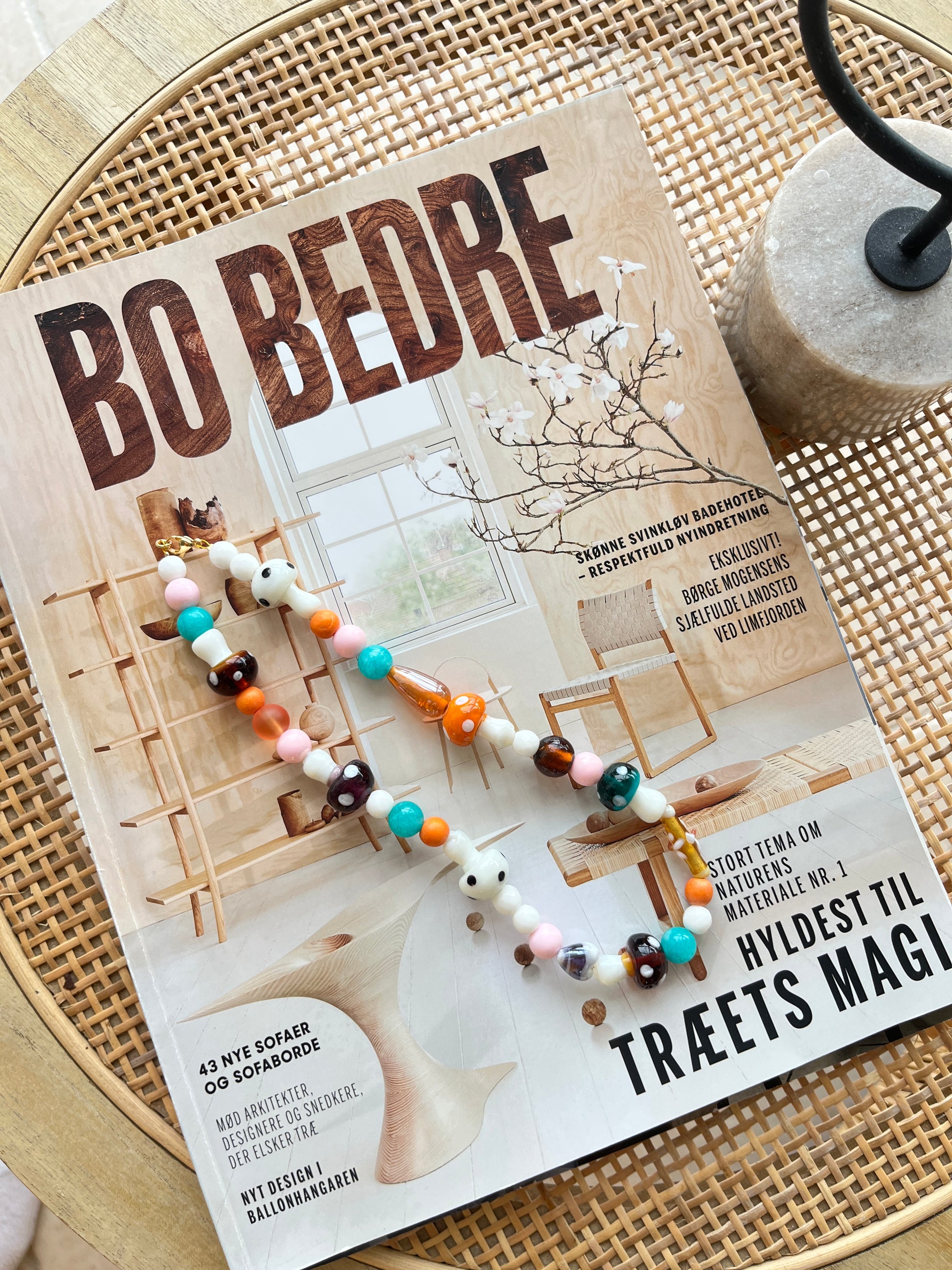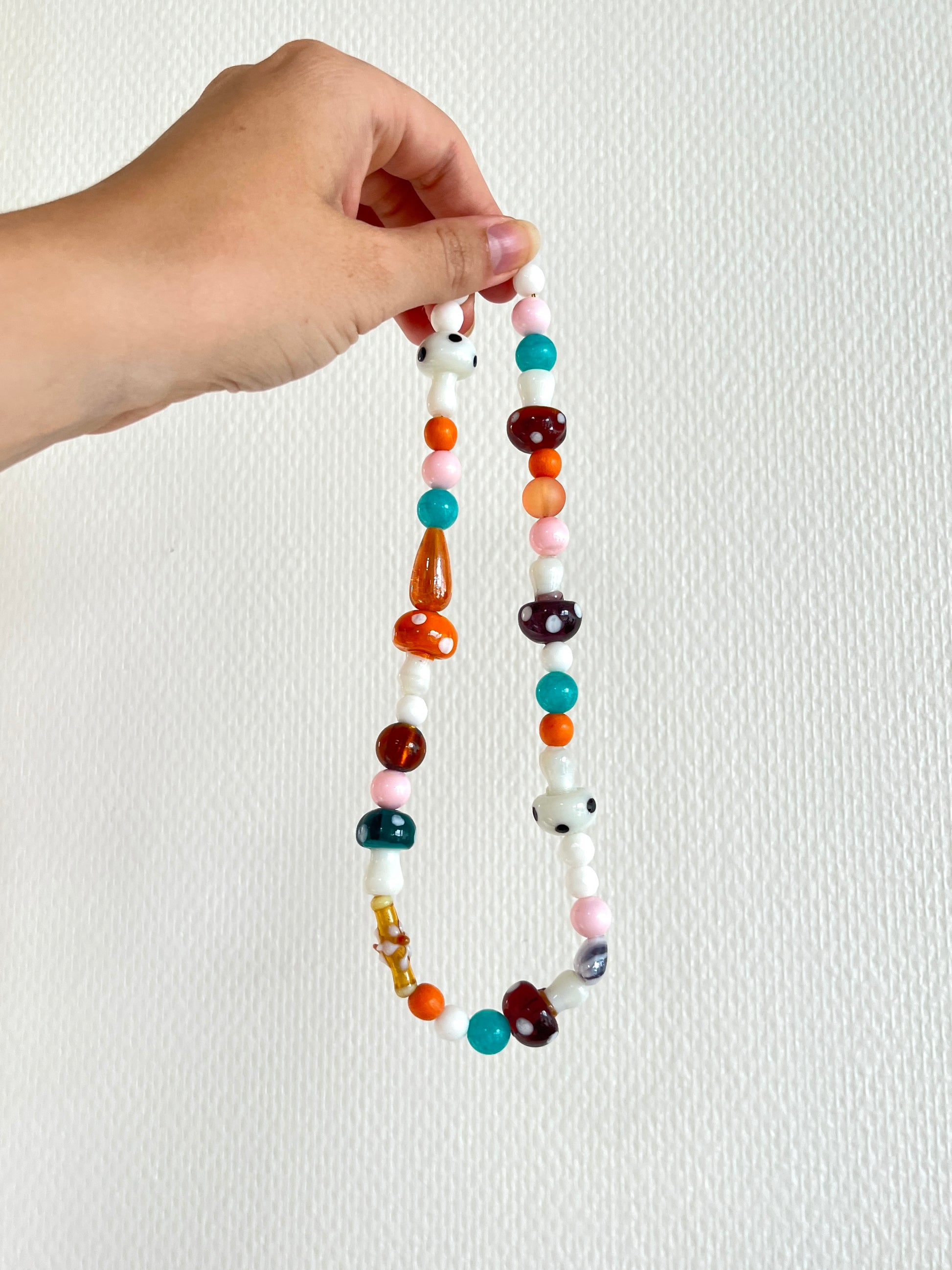 Skovtrold halskæden er til dig, der elsker farver. Med perler i glade nuancer af pink, orange, turkis og vinrød samt charmerende små svampe 🎨✨ Et perfekt statement piece til festivalsæson, hverdagsmagi eller som prikken over i’et på dit mest farverige outfit 🌟🌿
