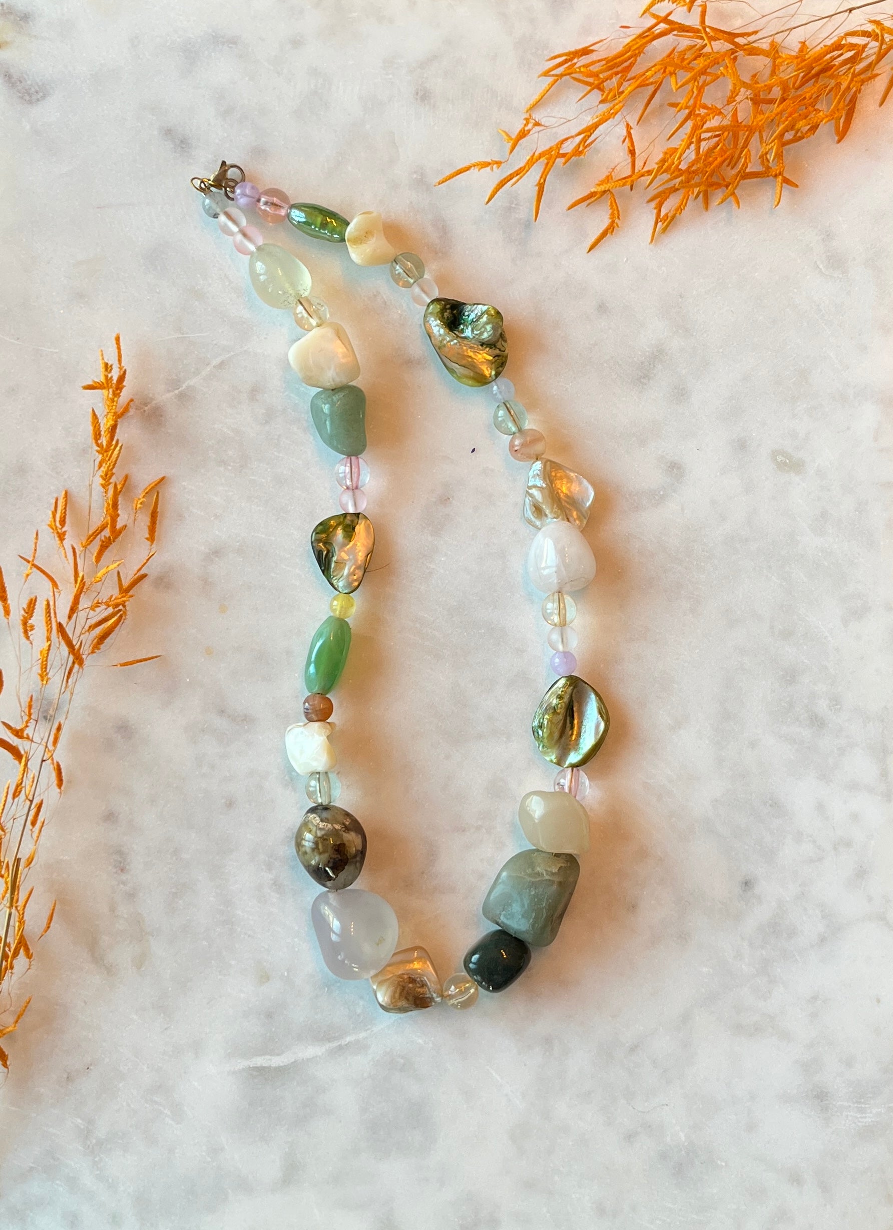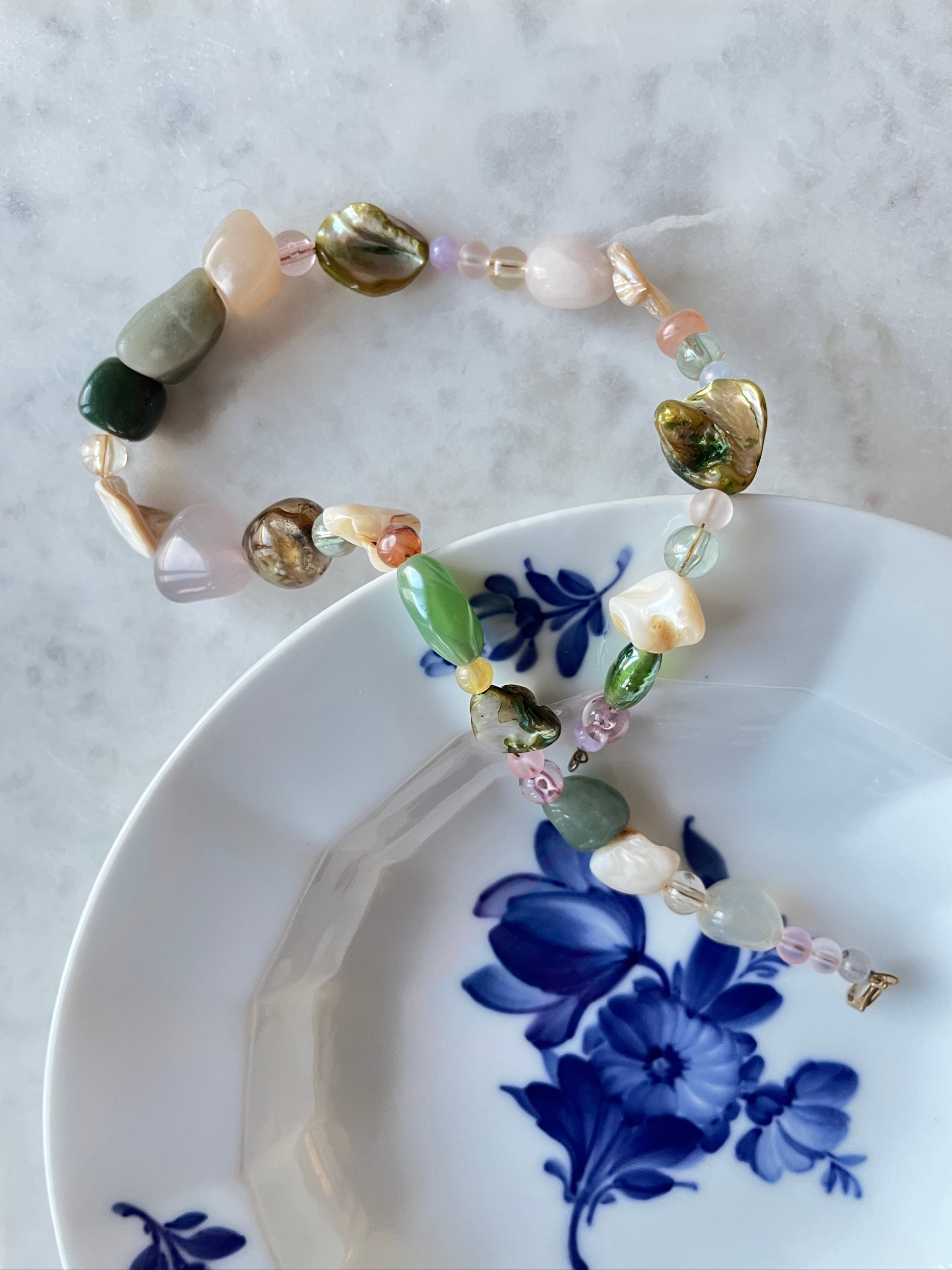 Sommerdrøm er en unik og håndlavet halskæde sammensat af farverige perler i naturlige former og blide nuancer som grøn, rosa og fersken ✨🌿🐚