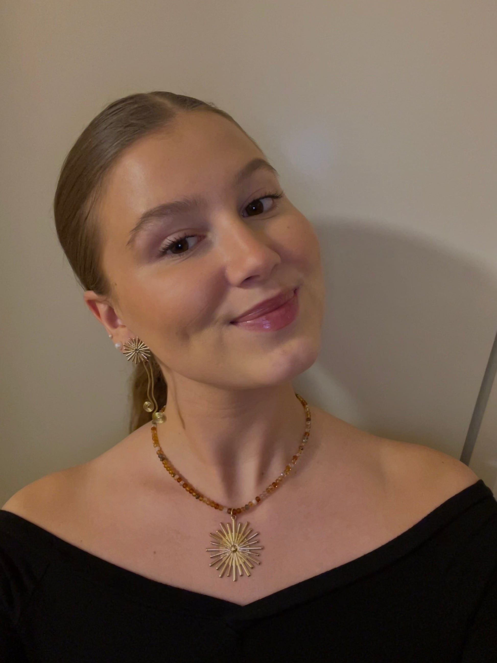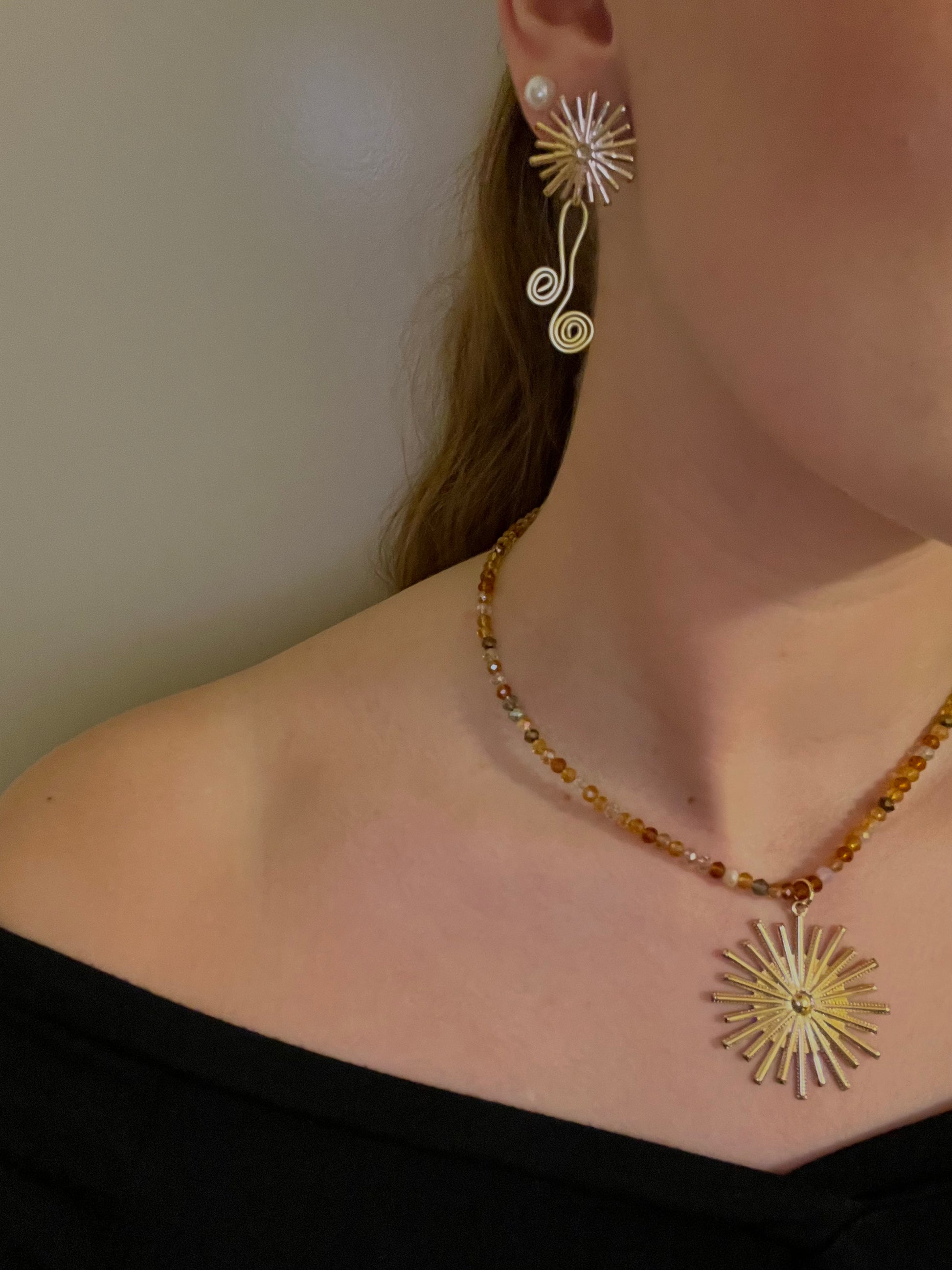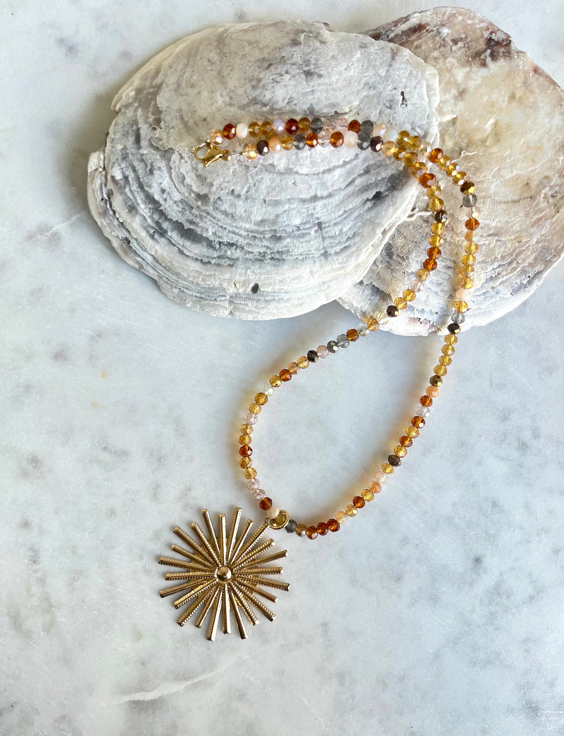 En festlig håndlavet halskæde der skinner fra de fine glasperler. Et statement piece med det flotte sol vedhæng ☀️✨