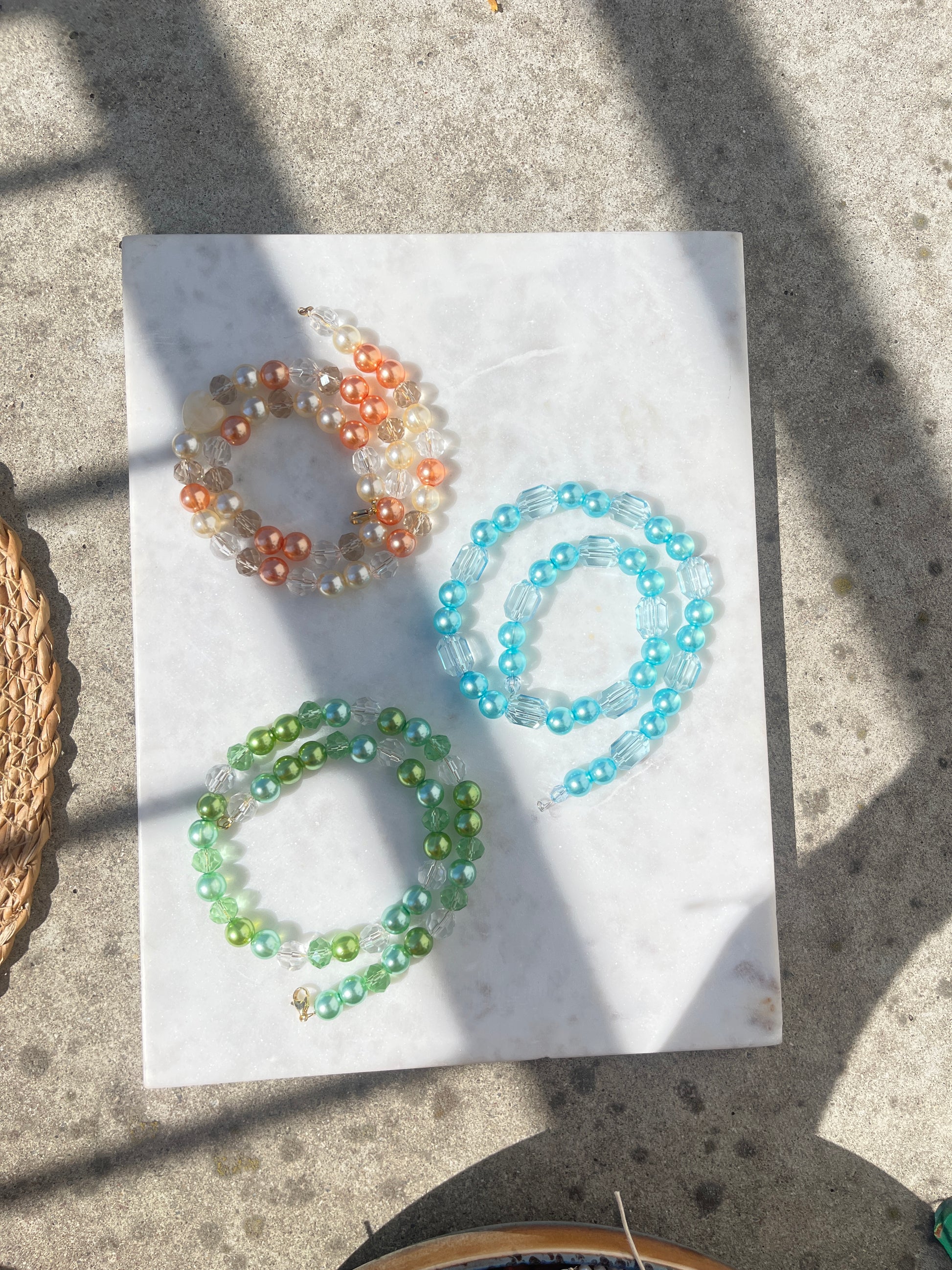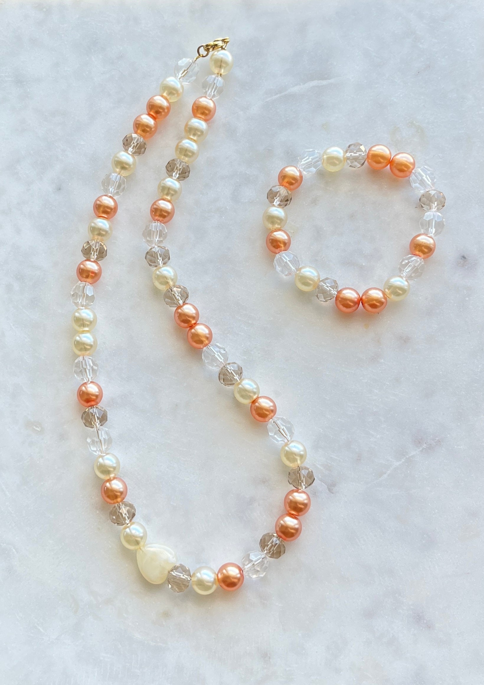 Et varmt og gyldent smykkesæt i orange og klare perler, der minder om en dejlig solnedgang ☀️✨☀️✨ Perler af akryl og glas.